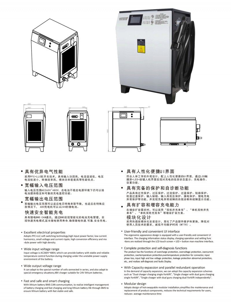 觸摸屏智能操作設(shè)計:告別傳統(tǒng)按鍵方式,給您帶來更現(xiàn)代更具科技智能的操作體驗 自動充電:插槍自動充電,簡化充電流程,便于操作 兼容性高:80V200A兼容48V200A充電 多重保護: 輸出短路,過流過壓保護,反接保護,電流導(dǎo)管保護等多重保護 預(yù)約充電功能:避開高峰用電時段,有效節(jié)省成本 雙語切換:中英文雙語隨需切換,跨越語言障礙,與世界接軌 人性化設(shè)計:充電機背板內(nèi)部附部件明細及產(chǎn)品接線圖,方便客戶可更清楚的了解產(chǎn)品,便于維修,提高售后時效 獨特設(shè)計: 內(nèi)置電磁鎖驅(qū)動模塊,防止臨時斷電鎖槍 使用壽命更長:功率模塊預(yù)留20%空間,提高模塊的使用壽命 出色內(nèi)部結(jié)構(gòu): 內(nèi)部結(jié)構(gòu)左右出風(fēng),內(nèi)部電路不容易積粉塵,提高充電機壽命