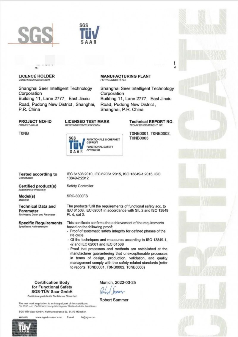 仙工智能 SRC-3000FS 由仙工智能自主研發的安全型 AMR 控制器,通過了 SGS TUV SAAR 功能安全認證。SRC-3000FS 集激光SLAM導航、功能安全于一體的,是目前唯一一個通過該認證的控制器產品。