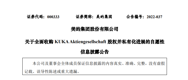 2021年11月,美的集團(tuán)發(fā)布公告稱,擬全面收購(gòu)庫(kù)卡股權(quán),收購(gòu)?fù)瓿珊螅瑤?kù)卡將成為美的全資控股的境外子公司,并從法蘭克福交易所退市。