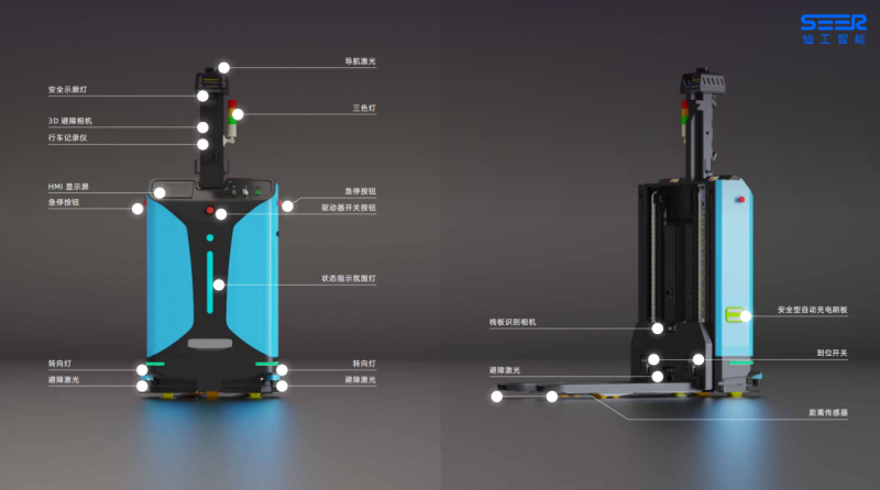 仙工智能 SRC 系列核心控制器打造的激光 SLAM 智能叉車整車實現多種傳感器的超高配置,360° 立體安全防護,提升了 AMR 運行過程中的安全等級,包括:導航激光、前后避障激光、安全觸邊、距離傳感器、急停按鈕、3D 避障相機等。