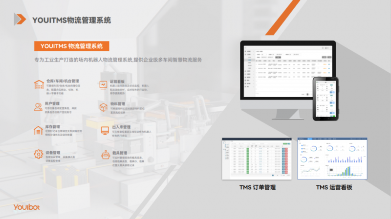 在移動機器人基礎(chǔ)上,優(yōu)艾智合智慧物流管理系統(tǒng)YOUI TMS與企業(yè)MES、WMS等信息化系統(tǒng)對接,100%追蹤回溯每一件物料信息,完成物料從備料倉到產(chǎn)線再到成品倉的完整閉環(huán),在提質(zhì)增效的基礎(chǔ)上幫助企業(yè)實行柔性生產(chǎn)與數(shù)字化管理。
