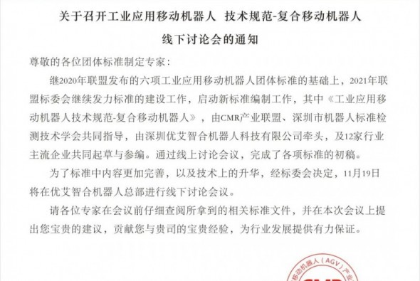 關(guān)于召開《工業(yè)應(yīng)用移動(dòng)機(jī)器人 技術(shù)規(guī)范-復(fù)合移動(dòng)機(jī)器人》線下討論會(huì)的通知