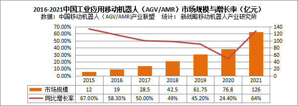 從市場規模來看,根據中國移動機器人(AGV/AMR)產業聯盟數據,新戰略移動機器人產業研究所統計、中國工業應用移動機器人銷售規模從2015年12億到2021年126億,實現了10倍增長。其中,2016年至2021年,中國市場工業應用移動機器人(AGV/AMR)產業年復合增長率約46%,尤其是2021年度全球新冠疫情的大規模影響之下,同比增長高達64%,遠遠超過絕大部分行業增長速度。