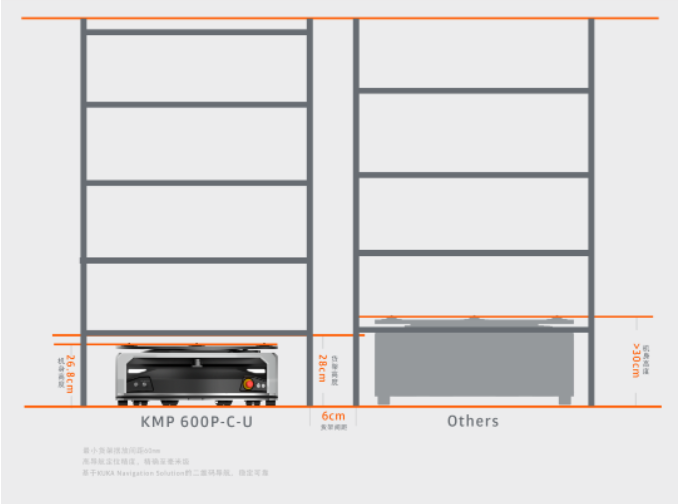 基于KUKA Navigation Solution的二維碼導航技術KMP 600P-C-U擁有穩定出色的導航系統,全面優化的運動控制精度鏈,可達到毫米級定位精度,具備貨架擺放位置調整功能,輕松實現1.3*1.3m大尺寸移動貨架的擺放間距6cm需求,為倉庫贏得更多平面空間,大大增加倉庫容積率,進而降低成本。