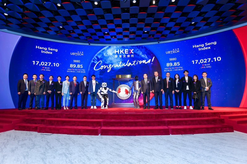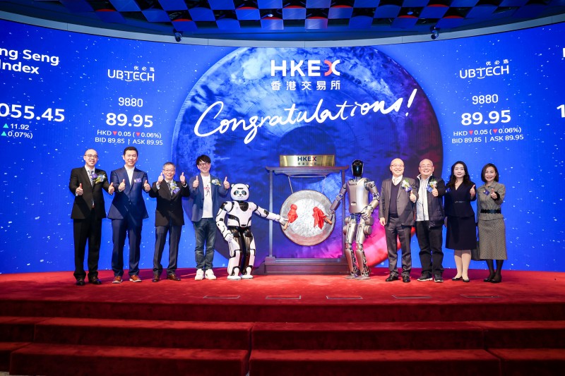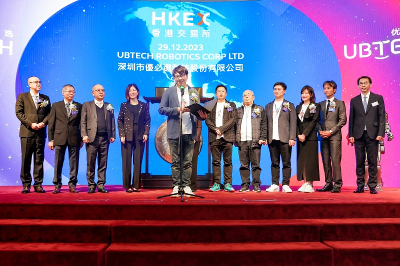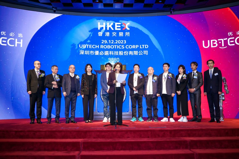 12月29日,優必選(股份代碼:9880.HK)正式在香港交易所主板掛牌上市,股價最高達91港元,對應市值約380億港元。香港特區政府創新科技及工業局局長孫東、香港特區政府引進重點企業辦公室執行總裁吳國才,香港聯交所上市委員會主席Renu Bhatia,香港交易所聯席營運總監陳翊庭,優必選董事會主席、執行董事兼行政總裁周劍等出席上市儀式,共同見證人形機器人第一股的正式誕生。