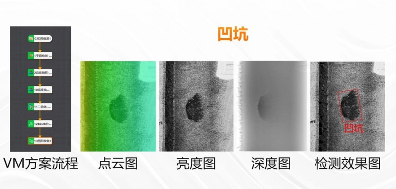 3D激光輪廓傳感器可有效識別缺陷、同時滿足生產節(jié)拍要求,完成全面檢測僅需旋轉一周。如下展示了鼓包、凹坑的實際測試圖像。