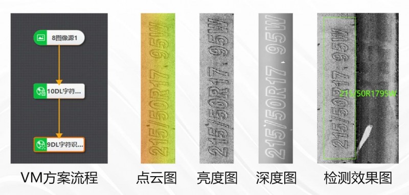 采用3D激光輪廓傳感器進行圖像采集,結合海康機器人AI訓練平臺,進行字符識別,可準確識別輪胎所有DOT碼。