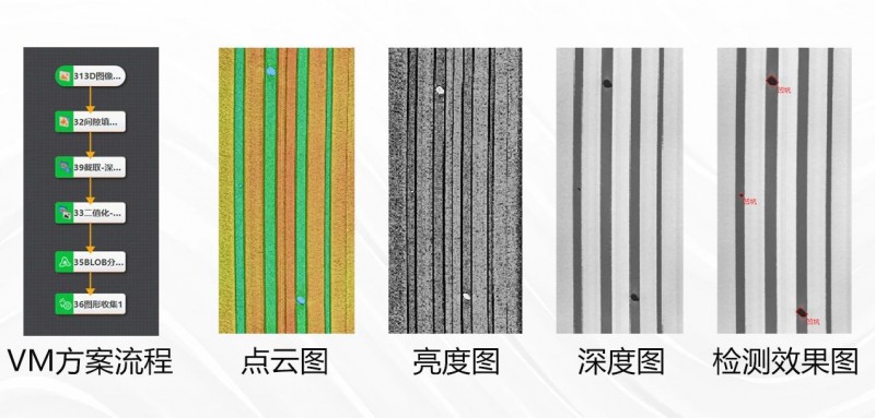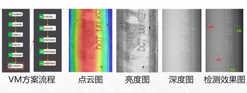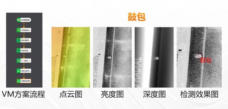 下圖展示了3D激光輪廓傳感器對輪胎胎毛的實際采集效果及VM檢測方案。