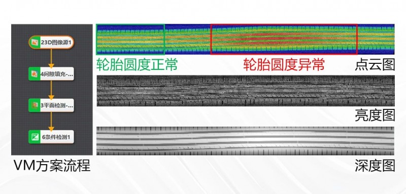 通過3D激光輪廓傳感器掃描輪胎正面、VM搭建方案實時測量輪胎單點高度值變化,當高度值變化低于一定的閾值時,認為輪胎是圓形的,當高度值變化高于一定的閾值時,認為輪胎不圓,此時剔除不良品。
