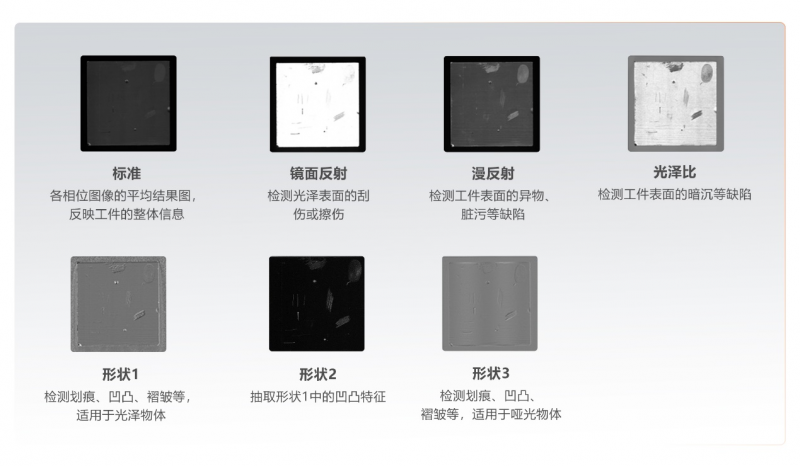 對此,海康機器人技術(shù)人員表示,2.5D系統(tǒng)中內(nèi)置多種模式的條紋圖案,可以根據(jù)不同操作場景自動響應(yīng)相匹配的光源圖案,真實反映物體表面的明暗分布;系統(tǒng)支持一鍵式檢測,快速輸出7種算法結(jié)果圖,全面展示多種缺陷。用戶可以在海康機器人2.5D客戶端軟件便捷地設(shè)置2.5D系統(tǒng)的參數(shù),集成多種調(diào)試工具,提高操作效率。