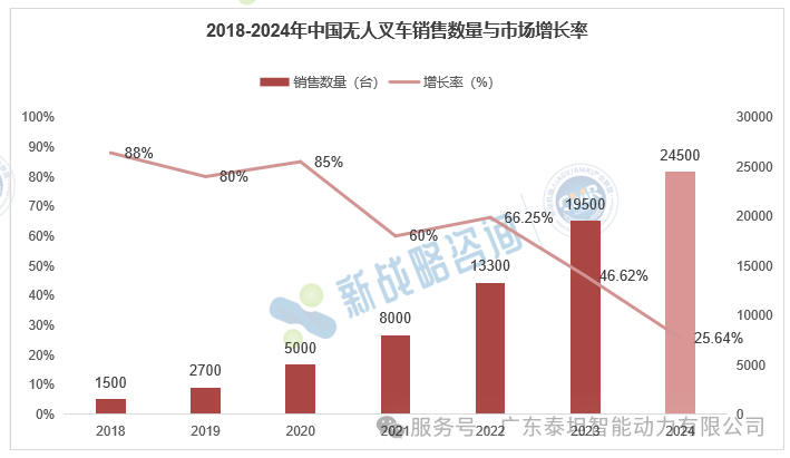 2024年,中國(guó)無(wú)人叉車市場(chǎng)交出了一份亮眼答卷——根據(jù)移動(dòng)機(jī)器人產(chǎn)業(yè)聯(lián)盟數(shù)據(jù)顯示,2024年,中國(guó)市場(chǎng)無(wú)人叉車全年銷量達(dá)24,500臺(tái),同比增長(zhǎng)25.64%,在移動(dòng)機(jī)器人整體市場(chǎng)中銷售占比為17.63%,成為移動(dòng)機(jī)器人領(lǐng)域增長(zhǎng)最快的細(xì)分賽道之一。