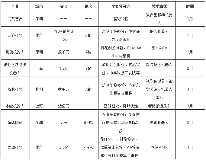 一季度,產(chǎn)品型公司開始集中爆發(fā),展露頭角。先后都拿到了資本方大小不等的融資,市場推進開始加快。例如海柔創(chuàng)新、優(yōu)艾智合、未來機器人等。經(jīng)過前期的發(fā)展,這些產(chǎn)品公司的相關(guān)產(chǎn)品已經(jīng)得到了市場驗證,開始進入成熟期,加上資本助力,市場拓展由此開始加速。