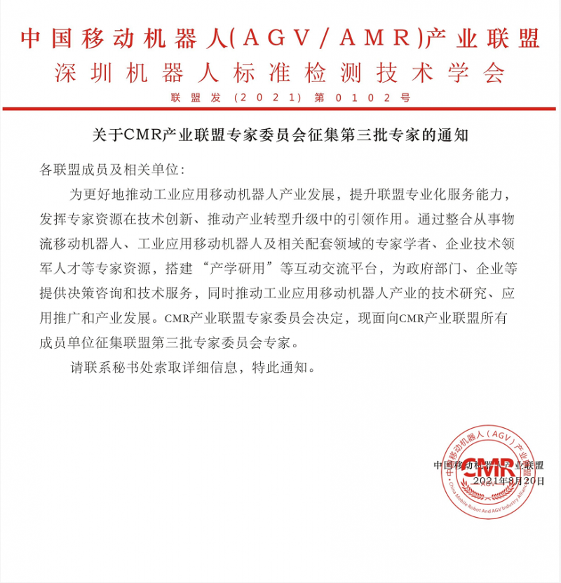 核心提示:中國移動機器人(AGV/AMR)產業聯盟專家委員會征集第三批專家的通知