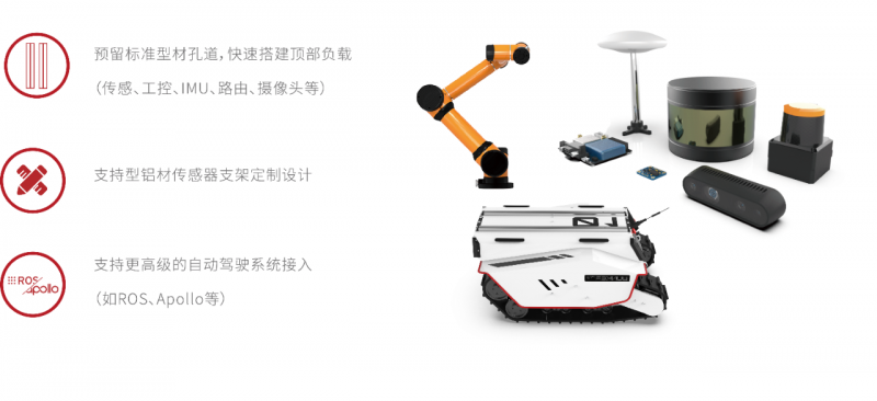 可以說,BUNKER Pro提供了在野外、箱涵、石泥路等高挑戰(zhàn)性環(huán)境下最佳的移動開發(fā)平臺,助力機器人行業(yè)和科研客戶快速部署和開發(fā)特殊作業(yè)機器人,諸如巡檢、勘探、消防、特種拍攝、特種運輸?shù)葢谩?/section>BUNKER Pro外觀結構全新設計,車身重心位置低,裝置了1500W雙伺服電機進行驅動,極具越野性。此外,其采用了克里斯蒂懸掛和瑪?shù)贍栠_四輪平衡多懸掛系統(tǒng)組合,并于全車安裝了加強版避震器和防撞擊結構組件,外觀采用了高強度和大厚度的鋼材,這為執(zhí)行特種作業(yè)應用提供了可靠的減震系統(tǒng)性能。 目前,BUNKER Pro最高越障可達18cm,爬坡度為<=30°,這意味著面對野外坡道和廠區(qū)樓梯,BUNKER Pro都可以一舉輕松爬越和穩(wěn)定運行。BUNKER Pro驅動形式為履帶差速轉向和左右獨立驅動,自研運動控制系統(tǒng)電機采用了2500線光電增量式碼盤,可以在復雜道路中實現(xiàn)高精度的控制,并且可以柔性實現(xiàn)0轉彎半徑原地自旋。BUNKER Pro外觀配置了防撞耐用的鋼質結構, 且整車結構、材料以及外置電氣元件均采用均采用高防護等級設計,達到了IP67安全標準,這是市面上同級別綜合路況移動平臺中防護等級最高的。其具備沙塵滲透防護、移動涉水和短暫浸泡防護(防浸)等優(yōu)勢,無懼任何潮濕、涉水、越野等極限工作環(huán)境,可以保證BUNER Pro極大拓展機器人的使用場景。基于高等級防護、模塊化和精簡部件結構設計,BUNKER Pro車體后期清潔也是十分便捷的,不藏污垢,不易腐蝕,易于維護。BUNKER Pro平臺空間大,可以在原地自旋過程中達到120kg載重,這意味著可以輕松搭載各類檢測設備。用戶可通過CAN總線協(xié)議與主控通訊,快速接入傳感系統(tǒng),搭建自主應用開發(fā)平臺,同時,BUNKER Pro也支持定制高級操作模式(遠程駕駛/自動駕駛),提供開源SDK、ROS_PACKAGE。BUNKER Pro還具有大電池容量,可在常規(guī)路面載重120kg運行情況下支持3小時續(xù)航, 也可對搭載的傳感器等外部設備進行供電, 為機器人應用的作業(yè)提供充足和便捷的運行保障。