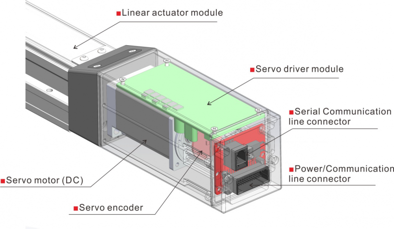 傳統(tǒng)模組的構(gòu)成:①模組底座+②直線導(dǎo)軌+③滾珠絲杠+④伺服電機(jī)+⑤伺服驅(qū)動器 + PLC(外部控制器)