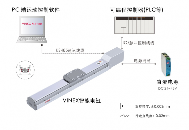 無需外置驅(qū)動器:Vinex采用驅(qū)動控制集成設(shè)計(jì),無需外置驅(qū)動器,通過電源線和通訊線纜即可驅(qū)動電缸。節(jié)省設(shè)備空間,大幅簡化走線和布線的成本。
