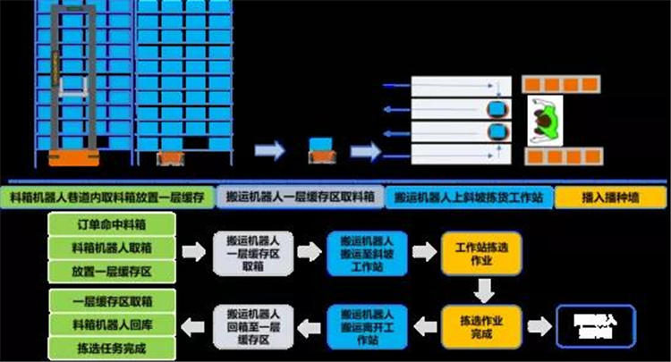 2017年,快倉智能開始研發(fā)箱式機器人,2019年,快倉箱式團隊通過總結(jié)多個項目經(jīng)驗,發(fā)現(xiàn)“箱式機器人+輸送線/緩存貨架”的作業(yè)模式遇到了“單機效率低、移動距離長、單倉最大處理能力有限”等瓶頸,于是萌發(fā)了“大工蓋樓,小工搬磚”的理念,Quick Pick解決方案從此誕生。