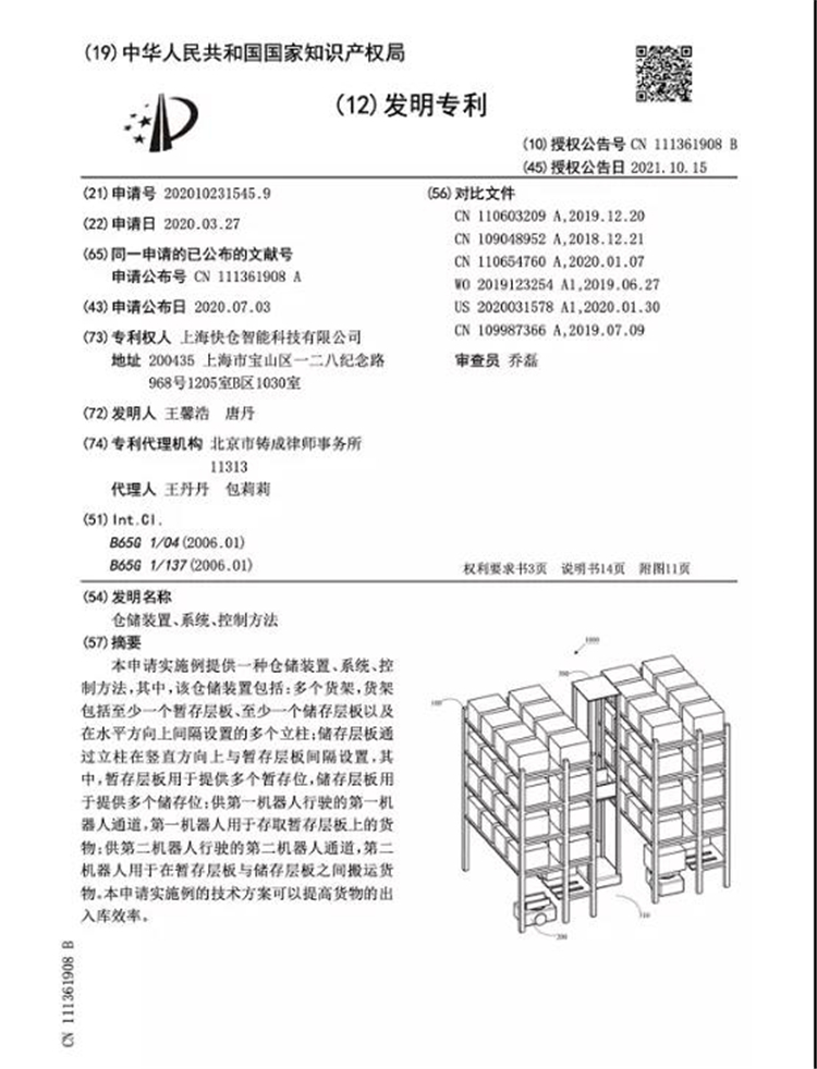 快倉Quick Pick方案以其先進性和創(chuàng)新性獲得了行業(yè)內(nèi)外的一直認可,2021年10月15日快倉QuickPick發(fā)明專利獲得正式授權(quán)!