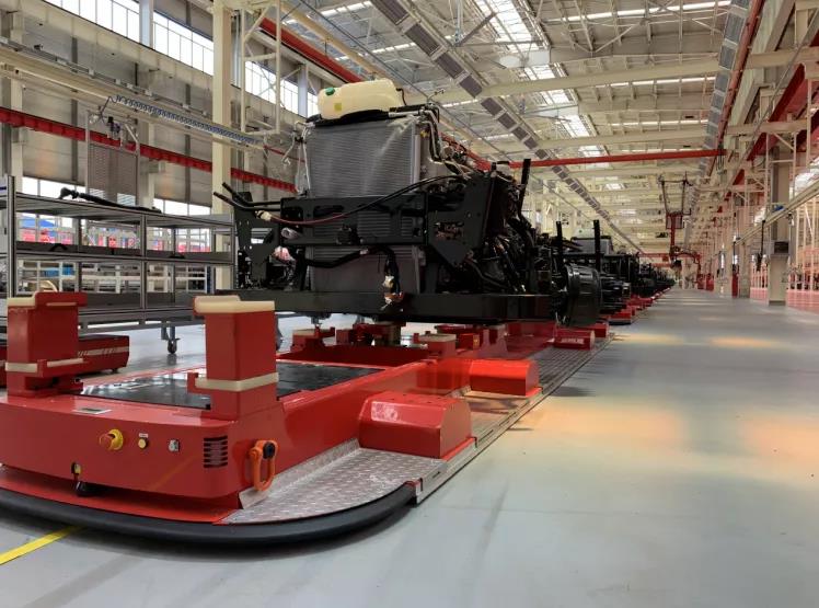 客戶為國內某著名工程機械廠商,本項目由CSG華曉為其量身定制的91臺AGV, 主線配備43臺大型定制裝配AGV,單臺承重超過10T,可實現1m/min~30m/min無級變速。相比傳統的拖鏈裝配線來說,AGV裝配線具有路線可調整,工位可擴展,投資更靈活的優勢。除了主線的提升以外,物流自動化同步改善,37臺SPS的潛伏牽引AGV自動匹配主線運行狀態,按單臺份定量配貨,解放線邊庫存空間的同時又提升了裝配的準確率。另外,5臺平衡懸架、前中后橋分裝頂升背負AGV,7臺發動機分裝后牽引AGV,24臺駕駛室分裝潛伏式牽引AGV,統籌協作實現全廠區內物流轉運的無人化。