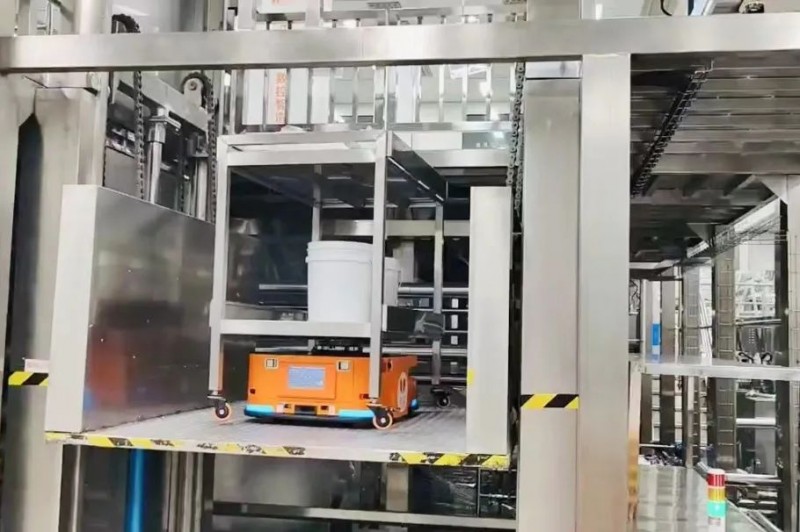 同時(shí),由Gulf-1400-CDD無人叉車機(jī)器人負(fù)責(zé)原材料從原料倉(cāng)到乳化車間的搬運(yùn)、空桶的產(chǎn)線返回、半成品從產(chǎn)線到車間的中轉(zhuǎn)、包材的產(chǎn)線搬運(yùn),搭配FMS調(diào)度管理系統(tǒng),實(shí)現(xiàn)最優(yōu)任務(wù)分配方案,讓倉(cāng)儲(chǔ)物流整體效能最大化。