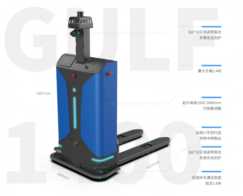 Gulf-1400-CDD無人叉車采用斯坦德自研激光SLAM導(dǎo)航技術(shù),無需固定基礎(chǔ)設(shè)施改造即可完成部署運(yùn)行,同時(shí)通過托盤到位檢測(cè)傳感器、貨叉防撞傳感器、3D視覺相機(jī)、RFID等多傳感器融合技術(shù),實(shí)現(xiàn)智能高效安全取放料作業(yè)。