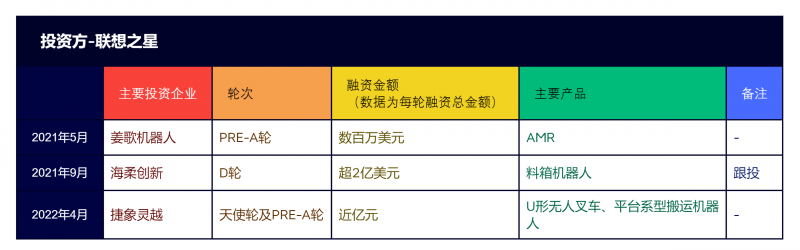 近兩年,聯(lián)想之星在工業(yè)移動(dòng)機(jī)器人領(lǐng)域投資了三家企業(yè),包括箱式倉(cāng)儲(chǔ)機(jī)器人科技企業(yè)海柔創(chuàng)新、機(jī)器人通用底盤(pán)松靈機(jī)器人、AMR機(jī)器人公司姜歌機(jī)器人,基本上都是從天使輪開(kāi)始切入。